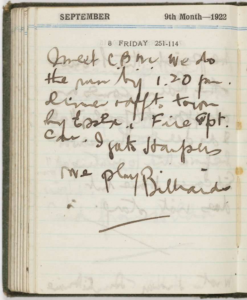 I met C.B.N.C.  We do the run by 1.20pm. Dinner and off to town by Essex . Fire Supt. Car. I go to Harpers and we play Billiards.