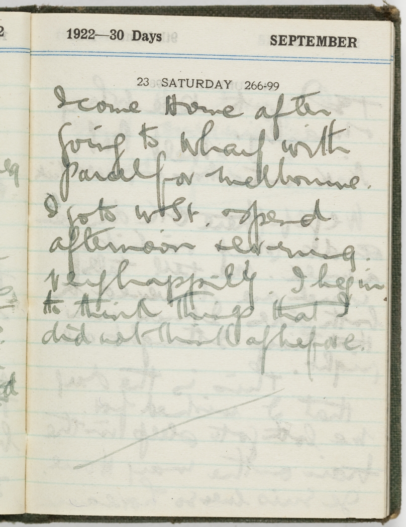 I come home after going to wharf with parcel for Melbourne. I go to W. St. and spend afternoon and evening very happily. I begin to think things that I did not think of before.