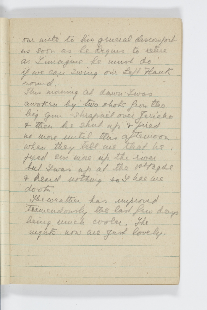 This morning at dawn I was awoken by two shots from the big gun – shrapnel over Jericho & then he shut up & fired no more until this afternoon when they tell me that he fired six more up the river but I was up at the 1st Bgde. & heard nothing so I hae me doots.