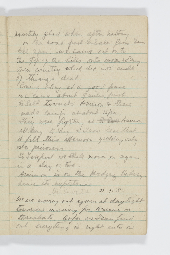 Coming along at a good pace we came about 9 miles past Es Salt towards Ammon & there made camp at about 4 p.m. They were fighting at Es Salt Ammon all day today & I now hear that it fell this afternoon yielding only 150 prisoners.