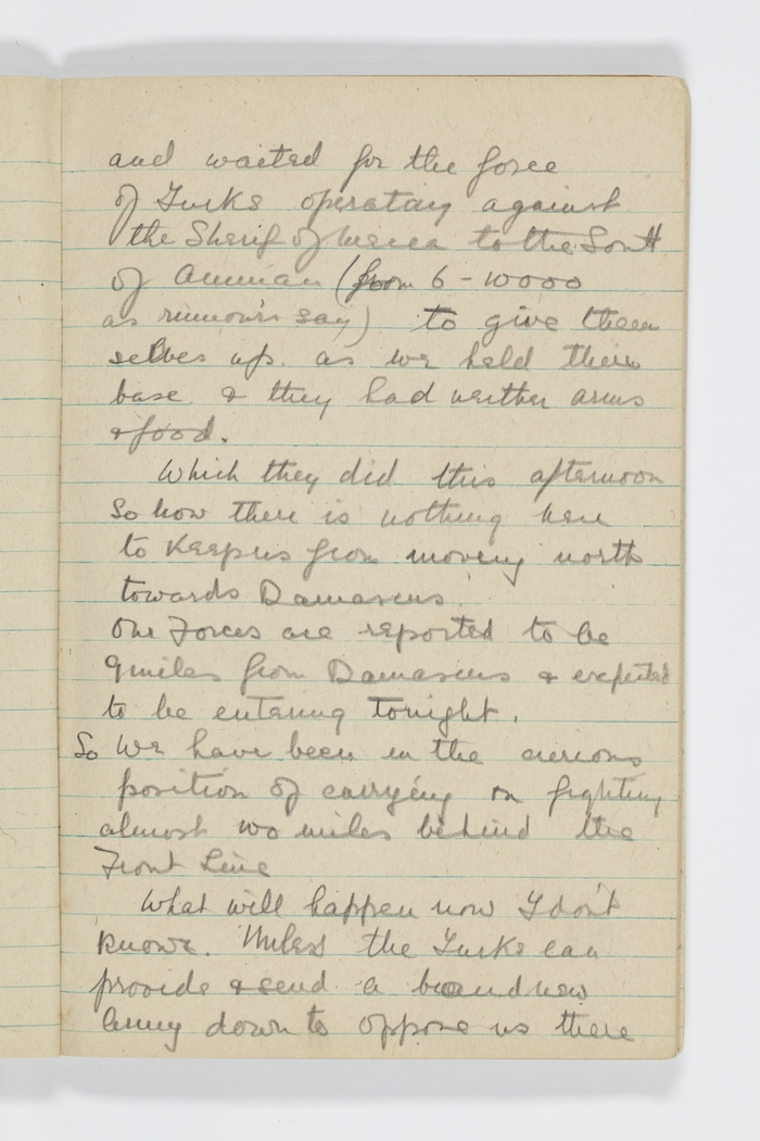 Our Forces are reported to be 9 miles from Damascus & expected to be entering tonight. So we have been in the curious position of carrying on fighting almost 100 miles behind the Front Line.