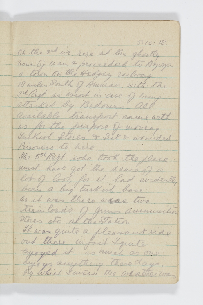 On the 3rd we rose at the ghostly hour of 4 a.m. & proceeded to Aziza, a town on the Hedjaz railway 18 miles South of Amman, with the 3rd Regt. as escort in case of being attacked by Bedouins. All available transport came with us for the purpose of moving Turkish Stores & Sick & wounded Prisoners to here.