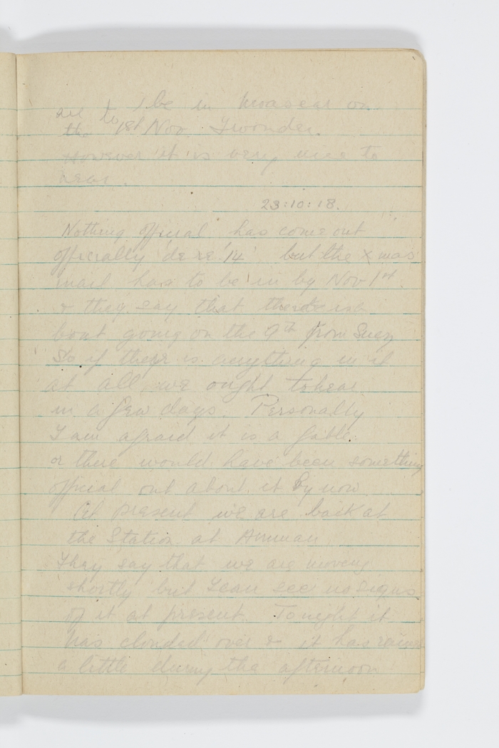 Nothing official has come out officially 'de re '14' but the Xmas mail has to be in by Nov. 1st & they say that there is a boat going on the 9th from Suez. So if there is anything in it at all we ought to hear in a few days. Personally I am afraid it is a fable or there would have been something official out about it by now. At present we are back at the Station at Amman. They say that we are moving shortly but I can see no signs of it at present. Tonight it has clouded over & it has rained a little during the afternoon