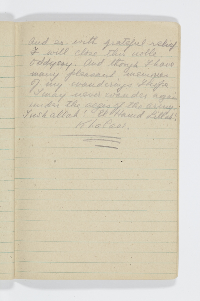 And so with grateful relief I will close this noble Oddysey. And though I have many pleasant memories of my wanderings I hope I may never wander again under the aegis of the Army. Inshallah! El Hamid Lillah! Khalass.
