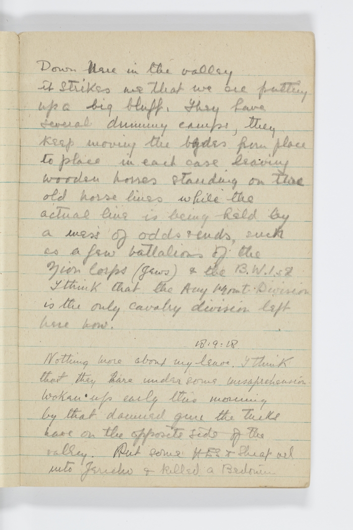 Down there in the valley it strikes me that we are putting up a big bluff. They have several dummy camps, they keep moving the bgdes. from place to place in each case leaving wooden horses standing on the old horse lines while the actual line is being held by a mess of odds & ends, such as a few battalions of the Zion Corps (Jews) & the B.W. 1 & 2. I think that the Anz. Mount. Division is the only cavalry division left here now.