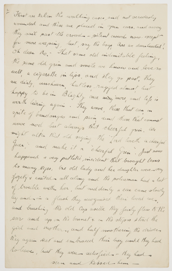 First are taken the walking cases and not seriously wounded and these are placed in open cars, and away they sail past the crowds – silent crowds now – except for more weeping, but, say the boys, Are we downhearted? Oh dear No. – That same old indomitable feeling, the same old grin and smile we know and love so well, a cigarette in lips, and they go past, they are dirty, unshaven, hatless, ragged almost, but happy to be in Blighty once may more, and life is worth living again. They wave, those that can, in spite of bandages and pain, and those that cannot wave nod but always that cheerful grin. We might alter that old saying The Lord loveth a cheerful Giver and make it a "cheerful Grin". Just now happened a very pathetic incident that brought tears to many eyes. One old lady and her daughter were very figety[sic] & excited all along and the policemen had a lot of trouble with her, but suddenly a car came slowly by and in a flash they recognised their loved one, and brushing the old cop aside they fairly flew to the car and up on the bonnet & on the steps stood the girl and mother, and half smothering the driver they again met and embraced their boy until they had to leave, but they were satisfied – they had seen and kissed him –
