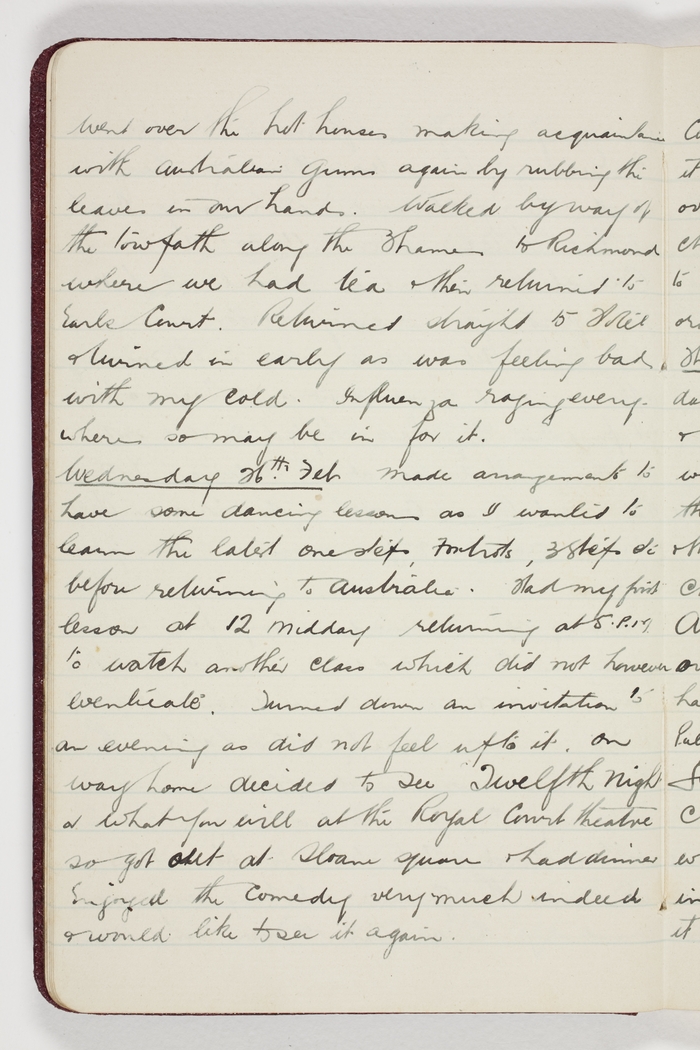 Wednesday 26th Feb. Made arrangements to have some dancing lessons as I wanted to learn the latest one step, foxtrot, 3 step etc. before returning to Australia. Had my first lesson at 12 midday returning at 5 p.m. to watch another class which however did not eventuate. Turned down an invitation to an evening as did not feel up to it. On way home decided to see "Twelfth Night" or What You Will at the Royal Covent Garden theatre so got out at Sloane Square & had dinner. Enjoyed the comedy very much indeed & would like to see it again.
