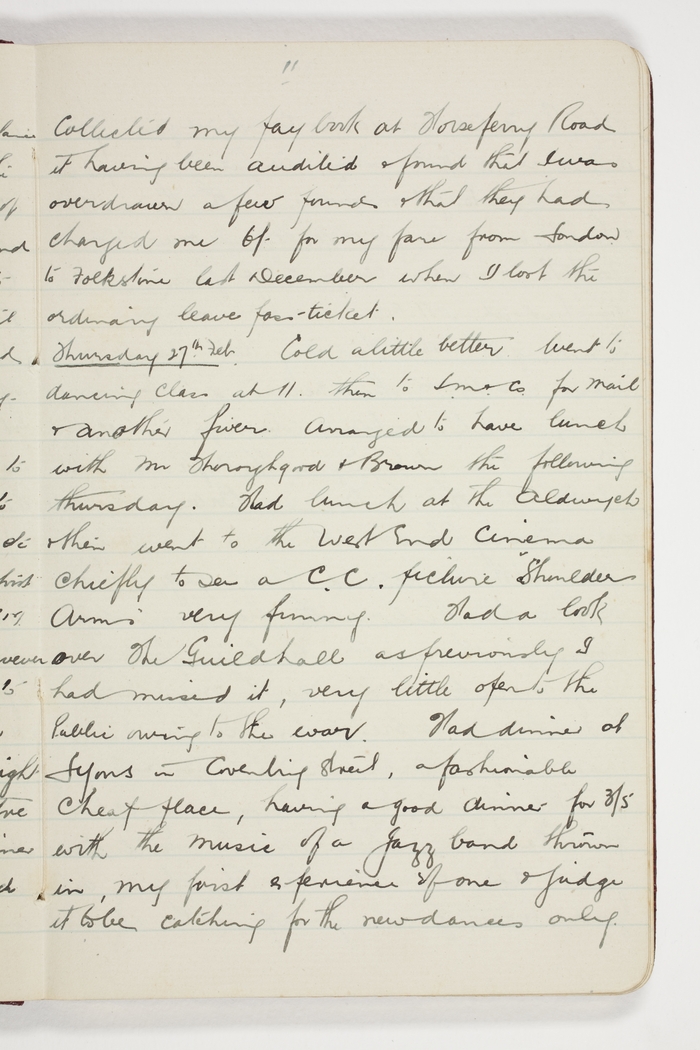 Thursday 27th Feb. Cold a little better went to dancing class at 11 and then to S.M. & Co. for mail and another fiver. Arranged to have lunch with Mr. Thoroughgood & Brown the following Thursday. Had lunch at the Aldwych & then went to the West End cinema chiefly to see a C.C. picture " Shoulder Arms" very funny. Had a look over the Guild Hall as previously I had missed it, very little open to the public owing to the war. Had dinner at Lyons in Coventry Street, a fashionable cheap place, having a good dinner for 3/5 with the music from a Jazz band thrown in, my first experience of one & judge it to be catching on for the new dances only.