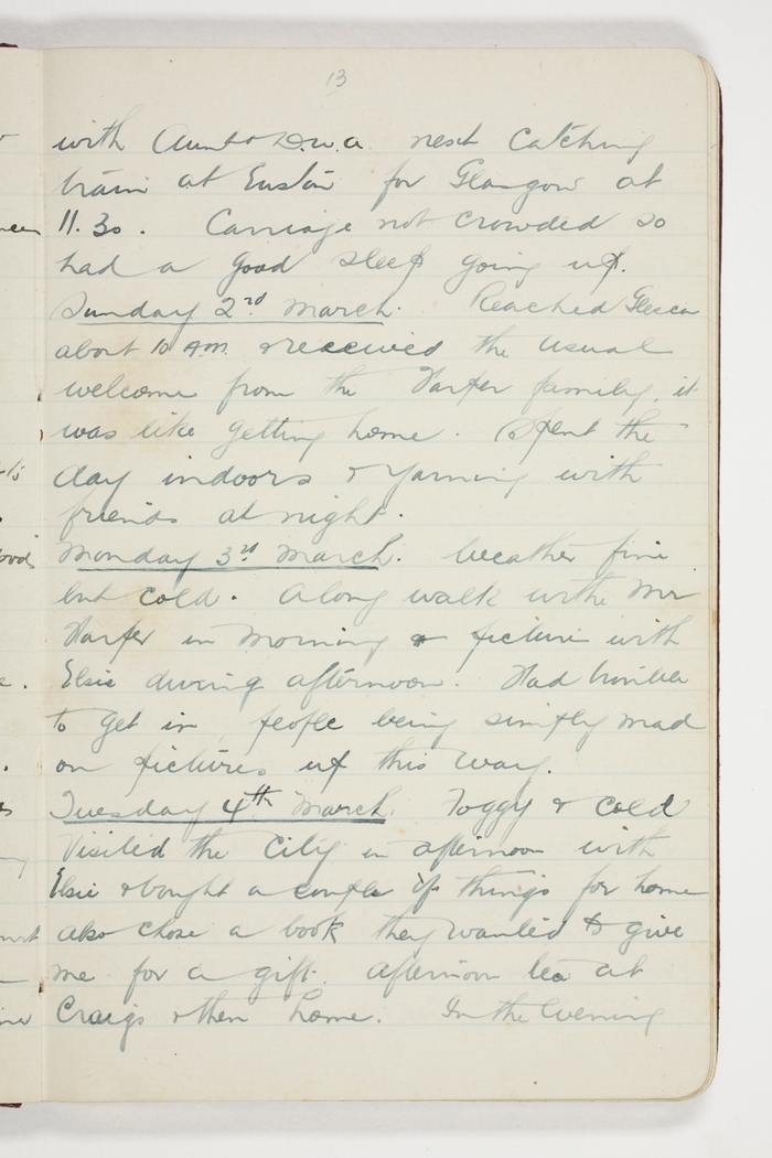 Monday 3rd March Weather fine but cold. A long walk with Mr. Harper in morning & pictures with Elsie during afternoon. Had trouble getting in people being simply mad on pictures up this way.