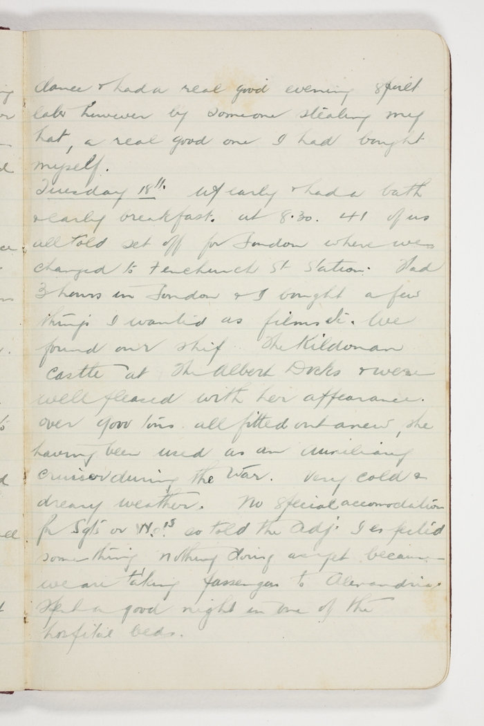Tuesday 18th Up early & had a bath & early breakfast. At 8.30. 41 of us all told set off for London where we changed to Fenchurch St. Station. Had 3 hours in London & I bought a few things I wanted as films etc. We found our ship the Kildonan Castle at the Albert Docks & were well pleased with her appearance over 9000 tons all fitted out anew, she having been used as an auxiliary cruiser during the War. Very cold and dreary weather. No special accommodation for Sgts or W.O.'s so told the Adj. I expected something. Nothing doing as yet because we are taking passengers to Alexandria . Spent a good night on one of the hospital beds.