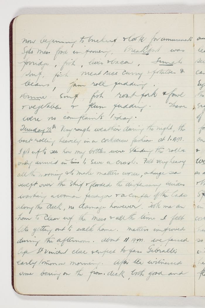 Tuesday 25th Very rough weather during the night, the boat rolling heavily in a corkscrew fashion. At 1 A.M. I got up to see how my bottles were standing the rolls only arrived in time to save a crash. Felt very heavy all the morning & to make matters worse, a huge sea swept over the ship & flooded the dispensary besides washing a women passenger & a couple of the lads along the deck, no damage however. Took me an hour to clean up the mess & all the time I felt like getting out to walk home. Matters improved during the afternoon. About 11 A.M. we passed Cape St. Vincent close and expect to pass Gibraltar early tomorrow morning. After tea witnessed some boxing on the prom deck, both good and