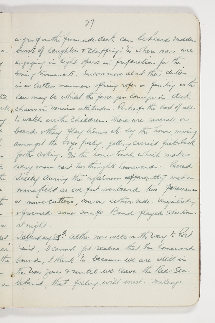 group on the promenade deck can be heard sudden burst of laughter & clapping: 'tis where men are engaging in light spars in preparation for the boxing tournaments. Sailors move about their duties in a listless manner splicing ropes or painting as the case may be whilst the passengers lounge in deck chairs in various attitudes. Perhaps the best of all to watch are the children. There are several on board and they play trains etc. by the hour, moving amongst the boys freely, getting carried pick a back for the asking. 'Tis the home touch which makes every man cast his thoughts homeward. Passed Sicily this afternoon & apparently met a minefield as we put overboard two paravanes or minecutters, one on either side. Very interesting and procured some snaps. Band played some selections at night.
