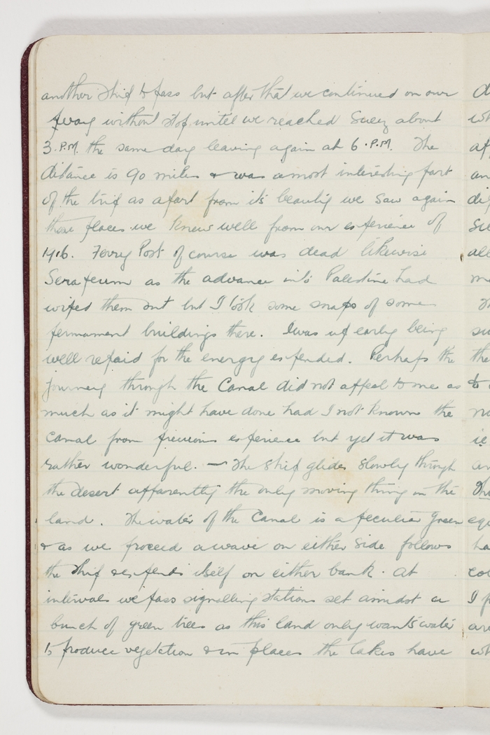 another ship to pass but after that we continued on our way without stop until we reached Suez about 3 P.M. the same day leaving again at 6 P.M. The distance is 90 miles & was a most interesting part of the trip as apart from its beauty we saw again the places we knew well from our experience of 1916. Ferry Post of course was dead likewise Serapeum as the advance into Palestine had wiped them out but I took some snaps of some permanent buildings there. I was up early being well repaid for the energy expended. Perhaps the journey through the Canal did not appeal to me as much as it might have done had I not known the canal from previous experience but yet it was rather wonderful.- The ship glides slowly through the desert apparently the only moving thing in the land. The water of the Canal is a peculiar green & as we proceed a wave on either side follows the ship & expends itself on either bank. At intervals we pass signalling stations set amongst a bunch of green trees as this land only wants water to produce vegetation & in places the lakes have