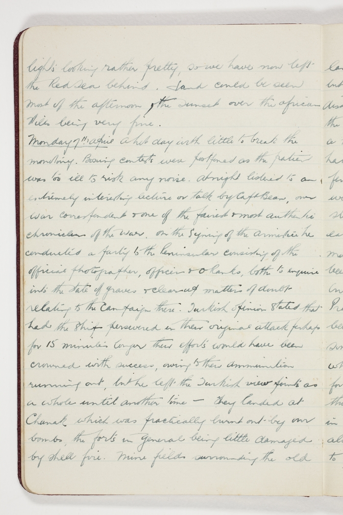 Monday 7th April A hot day with little to break the monotony. Boxing contests were postponed as the patient was too ill to risk any noise. At night listened to an extremely interesting talk by Capt Bean, our war correspondent & one of the fairest & most authentic chroniclers of the war, on the Signing of the Armistice he conducted a party to the Peninsular consisting of the official photographer, officers & ORanks, both to enquire into the state of graves & clear up matters of doubt relating to the Campaign there. Turkish opinion stated that had the ships persevered in their original attack perhaps for 15 minutes longer their efforts would have been crowned with success, owing to their ammunition running out, but he left the Turkish view points as a whole until another time – They landed at Chanak which was practically burnt out by our bombs, the forts in general being little damaged by shell fire. Mine fields surrounding the old