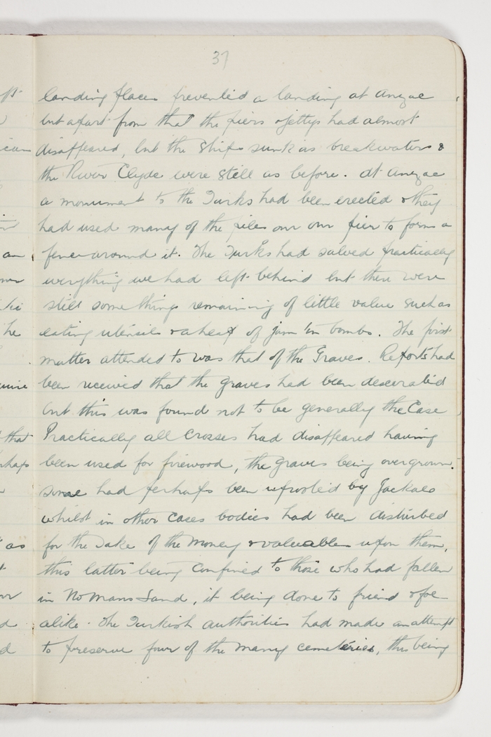 landing places prevented a landing at Anzac but apart from that the piers & jettys had almost disappeared, but the ships sunk as breakwaters & the River Clyde were still as before. At Anzac a monument to the Turks had been erected & they had used many of the piles on our own pier to form a fence around it. The Turks had salved practically everything we had left behind but there were still some things remaining of little value such as eating utensils & a heap of jam tin bombs. The first matter attended to was that of the Graves. Reports had been received that these had been desecrated but this was found not to be generally the Case. Practically all crosses had disappeared having been used for firewood, the graves being overgrown. Some had perhaps been uprooted by Jackals whilst in other cases bodies had been disturbed for the sake of the money & valuables upon them, this latter being confined to those who had fallen in No Mans Land, it being done to friend & foe alike. The Turkish Authorities had made an attempt to preserve four of the many cemeteries, this being