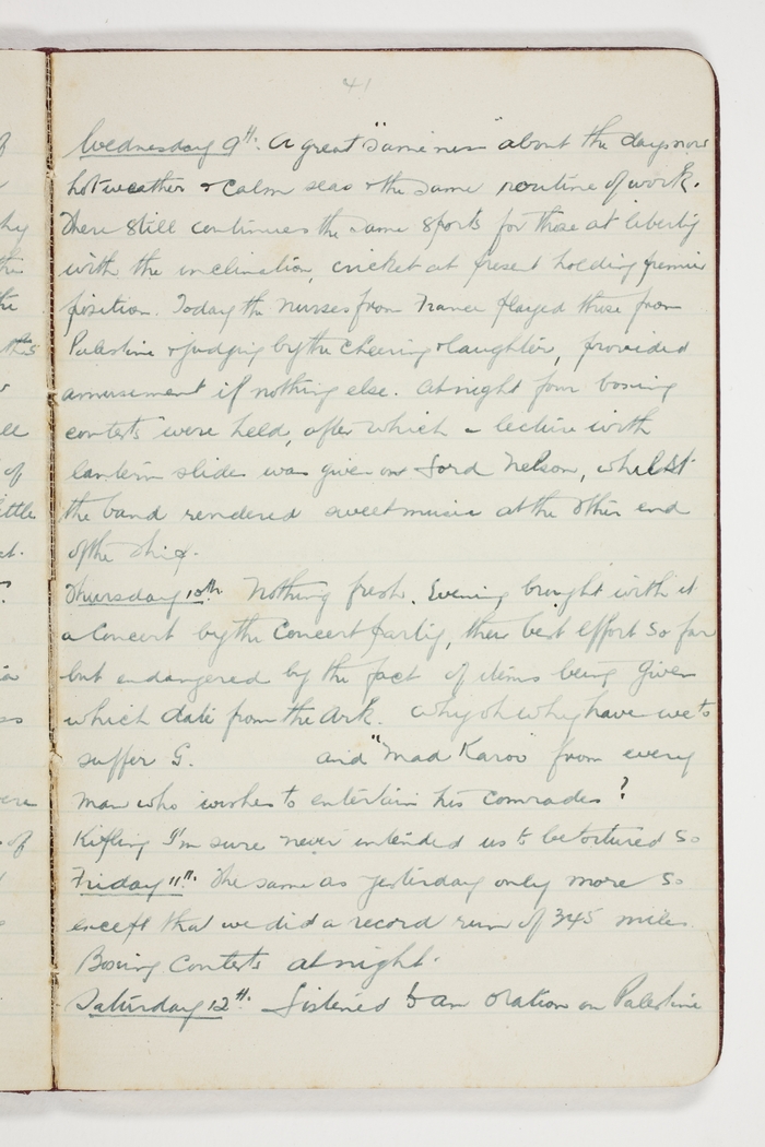 Wednesday 9th A great sameness about the days now hot weather & calm seas & the same routine of work. There still continues the same sports for those at liberty with the inclination, cricket at present holding premier position. Today the nurses from France played those from Palestine & judging by the cheering and laughter, provided amusement if nothing else. At night four boxing contests were held, after which- lecture with lantern slides was given on Lord Nelson, whilst the band rendered sweet music at the other end of the ship.