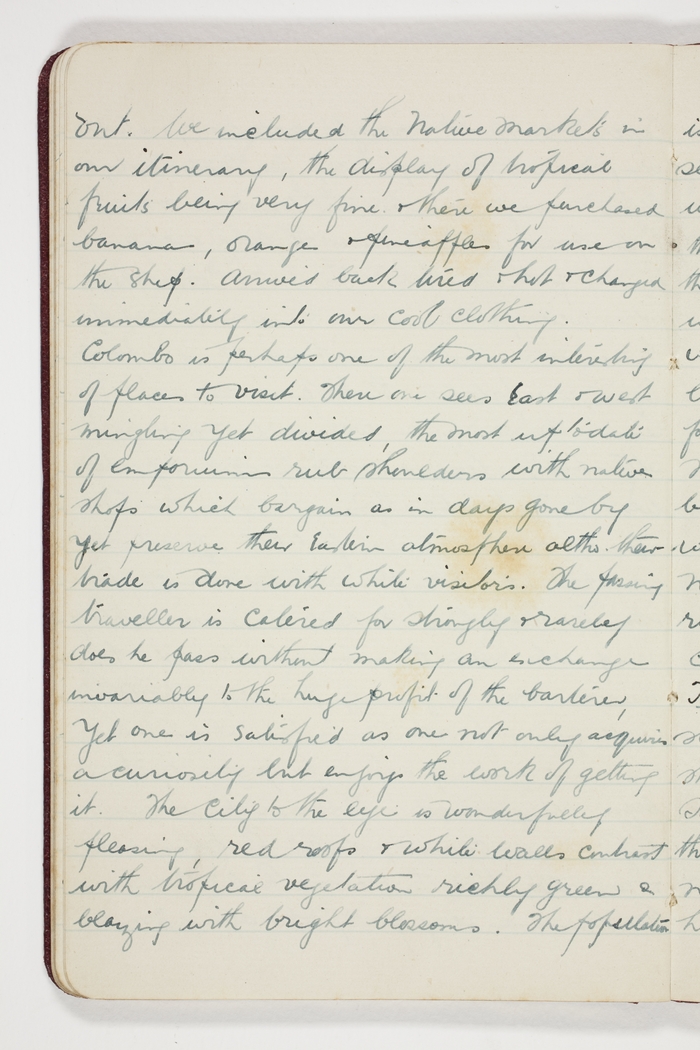 out. We included the Native Markets in our itinerary, the display of tropical fruits being very fine & there we purchased bananas, oranges & pineapples for use on the ship. Arrived back tired and hot & changed immediately into our cool clothing. Colombo is perhaps one of the most interesting of places to visit. There one sees east & west mingling yet divided, the most up to date emporiums rub shoulders with native shops which bargain as in days gone by yet preserve their native atmosphere although. their trade is done with white visitors. The passing traveller is catered for strongly & rarely does he go without making an exchange invariably to the huge profit of the barterer, Yet one is satisfied as one not only acquires a curiosity but enjoys the work of getting it. The city to the eye is wonderfully pleasing, red roofs & white walls contrast with tropical vegetation richly green & pleasing with bright blossoms. The population