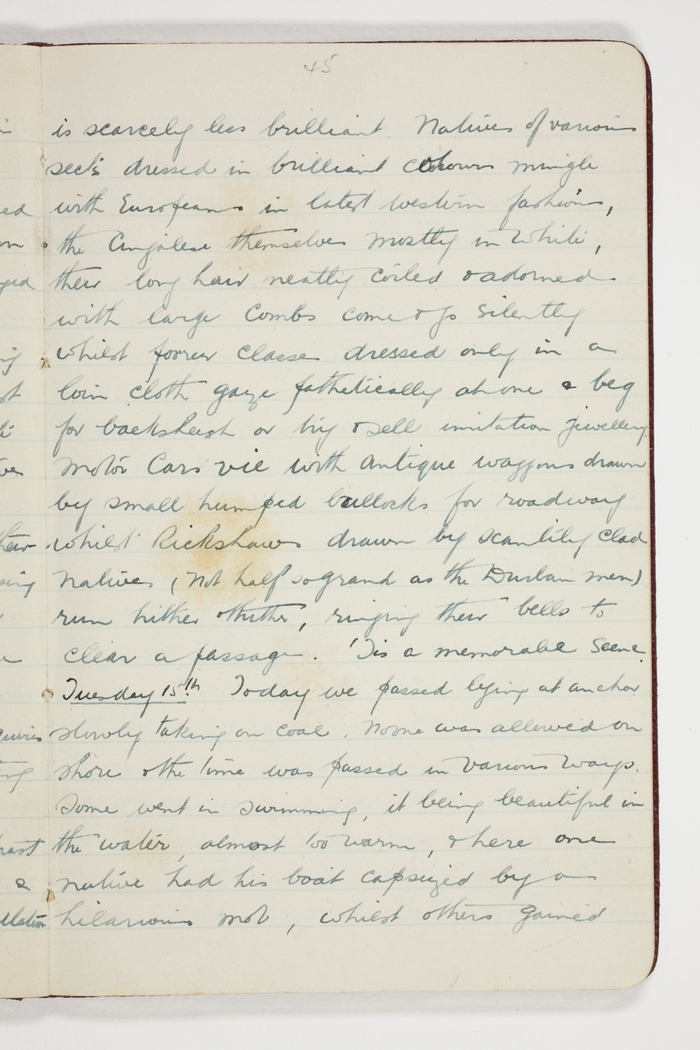 Tuesday 15th Today we passed lying at anchor slowly taking on coal. No one was allowed on shore & the time was passed in various ways. Some went in swimming, it being beautiful in the water, almost too warm, & here one native had his boat capsized by a hilarious mob, whilst others gained