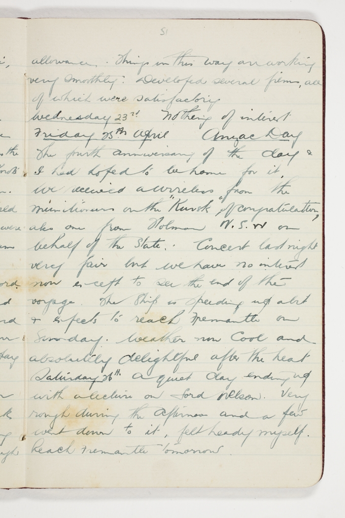 The fouth anniversary of the day & I had hoped to be home for it. We received a wireless from the munitioneers on the "Kursk" of congratulation, also one from Holman N.S.W. on behalf of the State. Concert last night but we have no interest now except to see the end of the voyage. The ship is speeding up a bit & expects to reach Fremantle on Sunday. Weather now Cool and absolutely delightful after the heat.