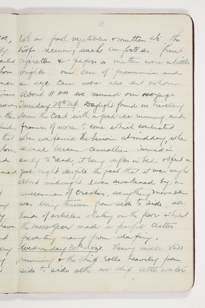 Tuesday 29th Ap. Daylight found us travelling down the Coast with a good sea running and promise of worse to come which eventuated when we passed The Leuwin at midday, when several became casualties. Turned in early to read, it being safer in bed & spent a good night despite the fact that it was rough. At midnight was awakened by a succession of crashes, everything moveable being thrown from side to side, all kinds of articles skating on the floor whilst the mess gear made a fearful clatter preventing many from sleeping.