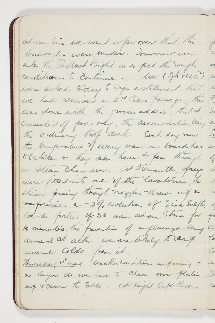 At one time we went so far over that the bulwarks were under. Tomorrow we enter the Gt. Aust. Bight so expect the rough conditions to continue. We (Sgts & W.O.'s) were asked to sign a statement that we received a 2nd Class passage, this being done with the proviso added, that it consisted of food only, the accommodation being the ordinary troop deck. Each day now the temperature of every man on board has to be taken & they are also asked to pass through a steam chamber. At Fremantle sprays were fitted - into one of the lavatories, the steam passing through nozzles draws up a vaporiser a 2 per cent solution of Zinc Sulph. We do parties of 50 men at one time for 10 minutes, the prevention of influenza being aimed at altho. we are likely to reap several colds from it.