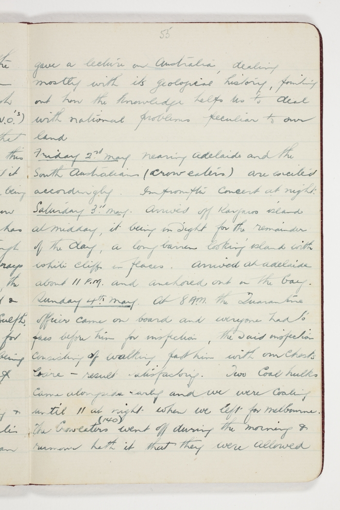 Saturday 3rd May. Arrived off Kangaroo island at midday, it being in sight for the remainder of the day, a long barren looking island with white cliffs in places. Arrived at Adelaide about 11 P.M. and anchored out in the bay.