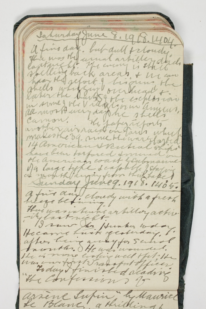 There was the usual artillery duels last night. The enemy is still shelling back areas & we can hear the retort of his guns the shells whizzing overhead & later the bursts of the explosions in some of the villages or in Amiens. All most every day he shells camon. The paper reports another air raid on Paris which makes the 39 since the war started. 14 American [Indecipherable] ships have been torpored & mined on the American coast by Submarines of a large type & capable of staying a month away from their bases.