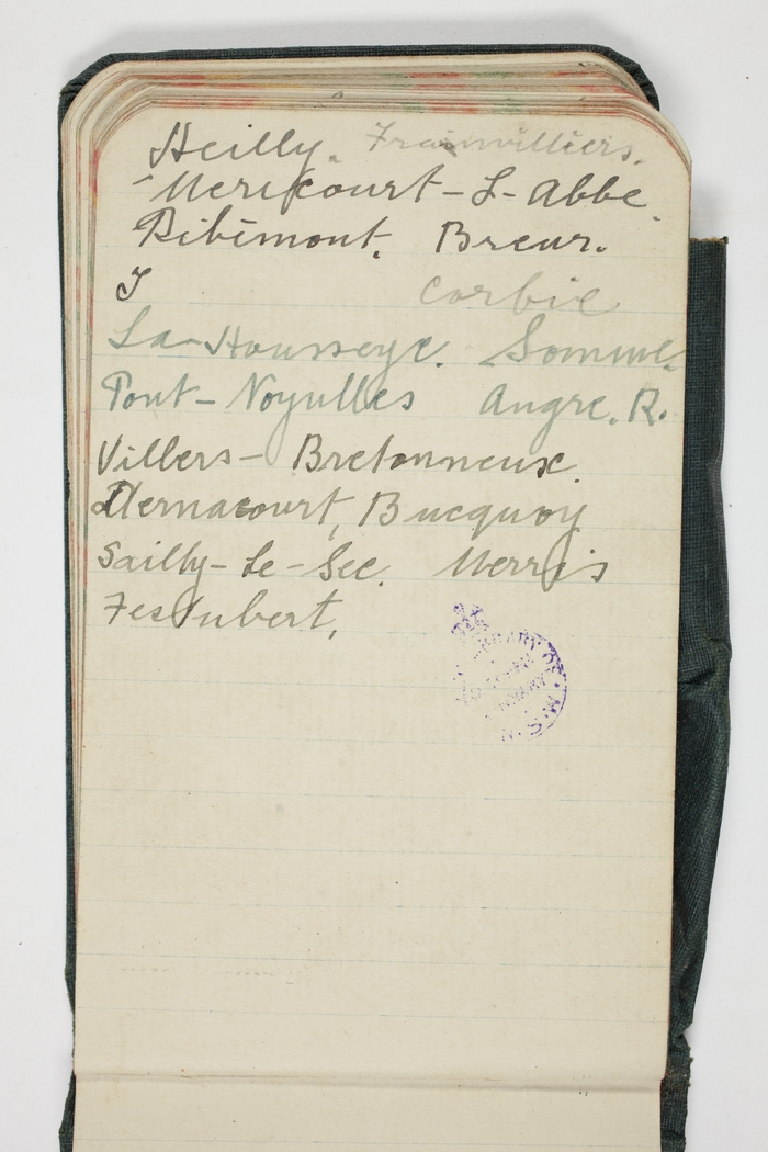 Heilly, Franvilliers. Mericourt-L-Abbe. Ribemont. Breur. T Corbie La-Housseye. Somme. Pont-Noyelles Angre.R. Villers-Bretonneux. Dermacourt, Bucquoy Sailly-Le-Sec. Merris Festubert.