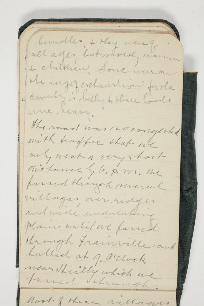 The road was so congested with traffic that we only went a very short distance by 6.p.m. we passed through several villages, over ridges and wide undulating plains until we passed through Frainville and halted at 9 O'clock near Huilly which we passed through.