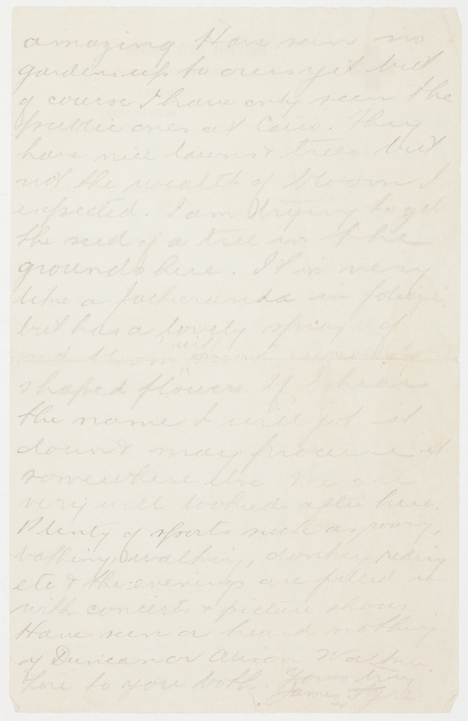 amazing. Have seen no gardens up to ours yet but of course I have only seen the public ones at Cairo. They have nice lawns & trees but not the wealth of bloom I expected. I am trying to get the seed of a tree in the grounds here. It is very like a Jackeranda [Jacaranda] in foliage but has a lovely spray of red blooms with [indecipherable] shaped flowers. If I hear the name I will jot it down & may procure it somewhere else. We are very well looked after here. Plenty of sports such as rowing, bathing, walking, donkey riding etc., & the evenings are filled in with concerts & picture shows. Have seen or heard nothing of Duncan or Alison Walker.