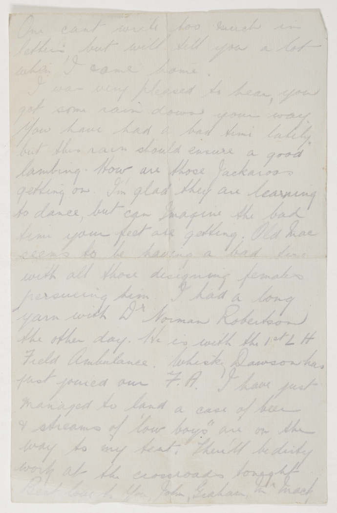 I was very pleased to hear you got some rain down your way. You have had a bad time lately, but this rain should ensure a good lambing. How are those Jackaroos getting on. I'm glad they are learning to dance, but can imagine the bad time your feet are getting. Old Mac seems to be having a bad time with all those designing females persuing him. I had a long yarn with Dr. Norman Robertson the other day. He is with the 1st L.H. Field Ambulance. Whisky Dawson has just joined our F.A. I have just managed to land a case of beer & streams of 'low boys' are on the way to my tent. There'll be dirty work at the crossroads tonight.