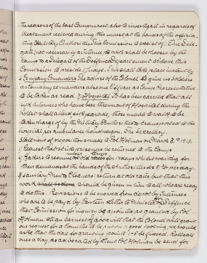 the reasons of the last Camp unrest, also to investigate in regards of treatment received during this unrest, at the hands of the officiating Military Authorities. This Comission to excist of: One Delegate (not necessarily a Internee) to (struck out)wich shall be choosen by the Camp & a Delegate of the Deffence Departement. Above this Comission to preside 1 Judge. This shall take place instantly 6/ Company Comanders The advice of the Colonel to give us Soldiers as Company commanders also one Officer as Camp Representative to be taken as read. 7/ Hospital It has been carried that all sick Internees, who have been thrown out of Hospital during the Protest shall attend "sick parade "those unable to walk, to be taken charge of by the Military Authorities & transported to the hospital per ambulance handwagon. The Secretary.