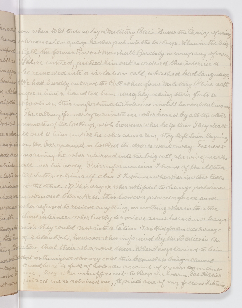 on when told to do so by the Military Police. Under the Charge of using obscence language he wher put into the lockup. When in the big Cell, the former Provost Marshall Bardsly in company of several Police entered, picked him out & ordered this Intenee to be remoived into a isolation cell, & teached bad language. He had hardly entered the Cell when four Military Police sett upon him & handled him roughly using their fists & Boots on this unfortunate Internee untill he couldn't move The calling for mercy & asistance wher heard by all the other inmates of the lockup, wich however wher helpless. They dealt it out to him untill he wher senseless, they left him laying on the bar ground & locked the door & went away. The next morning he wher returned into the big cell, shewing marks all over his body. This information I have of the illtreated Internee himself also 5 Internees who wher in other Cells at the time.