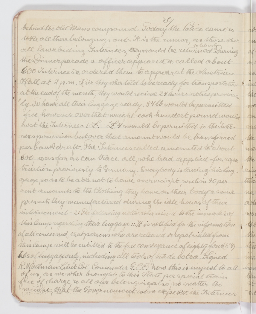 20/ Today the Police came & toke all their belongings out. It is the rumor, as those wher all lawabiding Internees, they would be returned to liberty. During the Dinner parade a officer appeared & called about 600 Internees & ordered them to appear at the Austrian Hall at 2 p. m. Hier they were told to be ready for transportation at the end of the month, they would recieve 24 hours notice previously. To hawe all their luggage ready. 84 lb would be permitted free, however over that weight each hundert pound would cost the Internees 1 & pound;. & pound; 4 would be permitted in the Internees possession but over that amount would be transferred per Bank draft. The Internees called amounted to about 600 & as far as can trace all, who had applied for repatriation previously to Germany. Everybody is taxing his luggage, so as to be able not to hawe overweight, within 90 per cent amounts to the Clothing they have on their body & some presents they manufactured during the idle hours of their internment – 21 The following notice wher issued to the inmates of this Camp regarding their luggage:: It is notified for the information of all concerned, that persens who are released or repatriated from this Camp will be entitled to the free conveyance of eighty four (84) lbs of luggage only, including all tools of trade ectra. Signed R. Hollman Lieut Col. Comander G. C. C: Now this is unjust to all of us, as we were brought to this State per special train free of charge, & all our belongings also, no matter the weight, that the Government now expekts the Internees