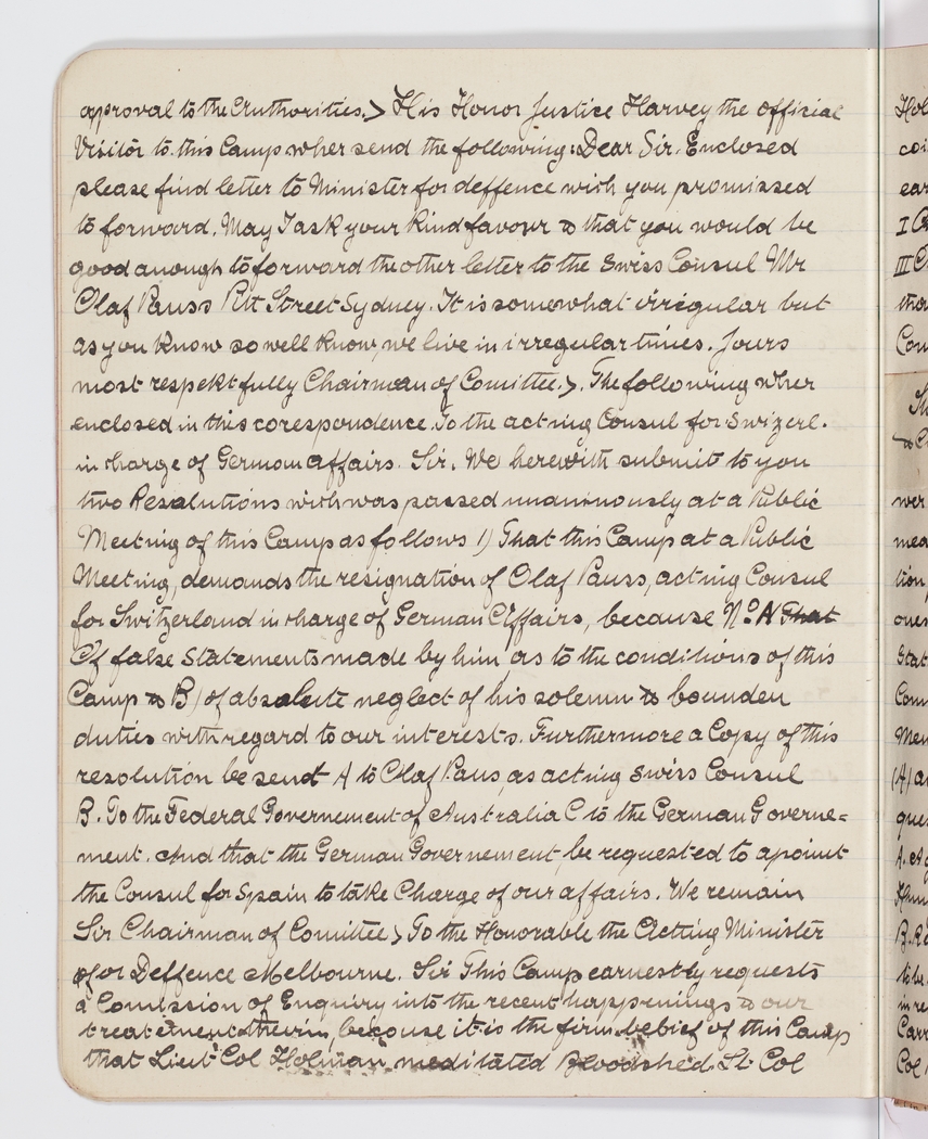 approval to the Authorities. > His Honor Justise Harvey the official Visitor to this Camp wher send the following: Dear Sir. Enclosed please find letter to Minister for deffence wich you promissed to forward. May I ask your Kind favour & that you would be good enough to forward the other letter to the Swiss Consul Mr Olaf Pauss Pitt Street Sydney. It is somewhat irregular but as you know so well know, we live in irregular times. Yours most respectfully Chairman of Committee. >. The following wher enclosed in this corespondence. To the acting Consul for Switzerl. In charge of German Affairs. Sir. We herewith submit to you two Resolutions wich was passed unanimously at a Public Meeting of this Camp as follows 1) That this Camp at a Public Meeting, demands the resignation of Olaf Pauss, acting Consul for Switzerland in charge of German Affairs, because No. A That Of false statements made by him, as to the conditions of this Camp & B) of absolute neglect of his solemn & bounden duties with regard to our interests. Furthermore a Copy of this resolution be sent A to Olaf Paus, as acting Swiss Consul B. To the Federal Governement of Australia C to the German Governement. And that the German Governeme 0n1. t be requested to appoint the Consul for Spain to take Charge of our affairs. We remain Sir Chairman of Comittee > To the Honorable the Acting Minister for Deffence Melbourne. Sir This Camp earnestly requests a Comission of Enquiry into the recent happenings & our treatment theirin, because it is the firm belier of this Camp that Lieut Col Holman meditated Bloodshed. Lt Col