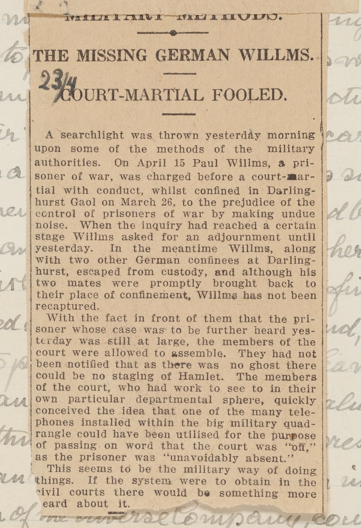 A searchlight was thrown yesterday morning upon some of the methods of the military authorities. On April 15 Paul Willms, a prisoner of war, was charged before a court-martial with conduct, whilst confined in Darlinghurst Goal on March 26, to the prejudice of the control of prisoners of war by making undue noise. When the inquiry had reached a certain stage Willms asked for an adjournment until yesterday. In the meantime Willms, along with two other German confinees at Darlinghurst, escaped from custody, and although his two mates were promptly brought back to their place of confinement, Willms has not been recaptured.