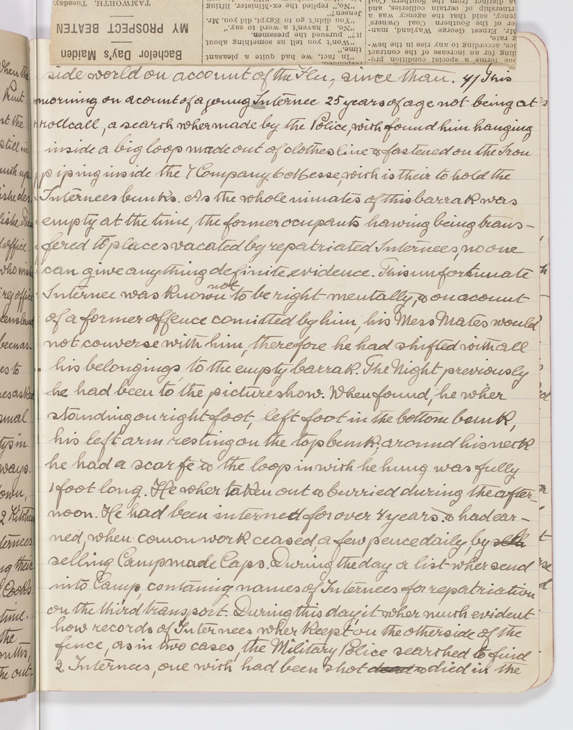 -side world on account of the Flu, since than. 4/ This morning on acount of a young Internee 25 years of age not being at roll call, a search wher made by the Police, wich found him hanging inside a big loop made out of clothes line & fastened on the Iron piping inside the 7 Company 6 Messe, wich is their to hold the Internees bunks. As the whole inmates of this barrack was empty at the time, the former ocupants hawing being transfered to places vacated by repatriated Interneees, no one can give anything definite evidence. This unfortunate Internee was known not to be right mentally, & on acount of a former offence comitted by him, his Mess Mates would not converse with him, therefore he had shifted with all his belongings, to the empty barrak. The night previously he had been to the pictureshow. When found, he wher standing on right foot, left foot in the bottom bunk, his left arm resting on the top bunk; around his heck he had a scarfe & the loop in wich he hung was fully 1 foot long. He wher taken out & burried during the afternoon. He had been interned for over 4 years & had earned, when comon work ceased, a few pence daily, by selh selling Campmade Caps. During the day a list wher send into Camp, containing names of Internees for repatriation on the third transport. During this day, it wher much evident how records of Internees wher Keept on the otherside of the fence, as in two cases, the Military Police searched to find 2 Internees, one wich had been shot dead & died in the