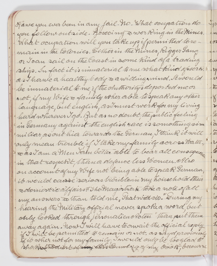 Have you ever been in any Jail. No. What ocupation do you follow outside. Boxcing & working in the Mines. What ocupation will you take up if permitted to remain in the Colonies. Either in the Mines, Rigger Gang or I can sail on the Coast in some kind of a trading ship. In fact it is immaterial to me what kind of work, as I have a healthy body & a willing mind. It would be immaterial to me, if the Authoritys deported me or not, if my Wife & family wher able to speak any other language, but english, as I must work for my living hard wherever I go. But as no doubt, the public feeling in 0Germany against the english race is something simmiliar, as out hier towards the German, I think it will only mean trouble, if I take my family across Water, & as I am a Men I am better able to bear all consequence in that respekt, than a defenceless Women. Also on account of my Wife not being able to speak German, it would cause serious trouble in my household their & domestic affairs. The Magistrate toke a note of all my answers & than told me "That will do. " During my hearing the Military official never spoke a word, but only looked through "Personalien Acten" than put them away again. Now I will hawe to await the official reply if I will be permitted to remain in or not, as sayd previously if it wher not for my family, I would only be too glad to shake the dust of my this Country of my boots, becourse