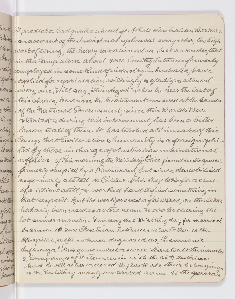 I predict a bad future ahead for the whole Australian Workers on account of the Industrial upheaval every wher, the high cost of living, the heavy taxation ectra. It is a wonder, that in this Camp alone about 4000 healthy Internees formerly employed in some kind of industry in Australia, hawe aplied for repatriation willingly & gladly & allmost every one, Will say "Thank god" when he sees the last of this shores, becourse the treatment recieved at the hands of the National Government, since this World War started & during their internment, has been a bitter lesson to all of them. It has teached all inmates of this Camp that Civilication & humanity is a foreign ephited by those in charge of Australian international affairs. 9/ This morning the Military Police found on the space formerly ocupied by a Restaurant, but since demobilised as formerly stated, a Cellar. This they took for a clue of a illicit still, & worked hard to find something in that respekt. But the work proved a faillure, as this Cellar had only been used as a store room & cooler during the hot summer months. This day the I Wisiting day for married Internees 10. Two Austrian Internees wher taken to the Hospital, & the sicknes dignosed as "Pnoumonic Influenza" This gawe indeet a severe Scare to all the inmates2 Companys of Internees in wich the sick Internees had lived wher ordered to park all their belongings & the Military wagons carted same to the quaran