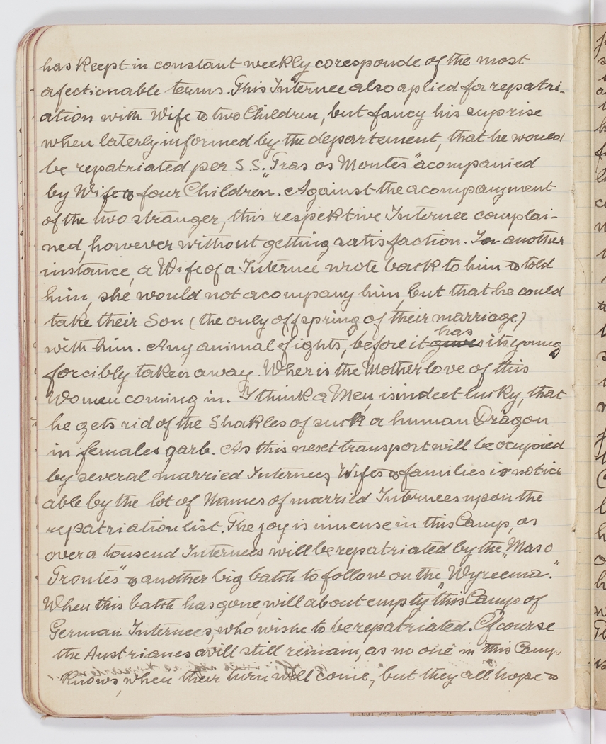 has kept in constant weekly corespondende of the most afectionable terms. This Internee also aplied for repatriation with Wife & 2 children, but fancy his surprise when laterly informed by the Departement, that he would be repatriated per S. S. "Gras os Montes" acompanied by Wife & four Children. Against the acompanyment of the two stranger, this respektive Internee complained, however without getting satisfaction. In another instance, a Wife of a Intenee wrote back to him & told him, she would not acompany him, but that he could take their Son (the only offspring of their marriage) with him. Any animal fights, before it gives has its young forcibly taken away. Wher is the mother love of this Women coming in. I think a Men, is indeet lucky, that he gets rid of the Shakles of such a human Dragon in females garb. As this next transport will be ocupied by several married Internees, Wifes & families is noticeable by the lot of Names of married Internees upon the repatriation list. The joy is immense in this Camp, as over a tousend Internees will be repatriated by the " Mas o Frontes" & another big batch to follow on the "Wyreema. " When this batch has gone, will about empty this Camp of German Internees, who wishe to be repatriated. Of course the Austrianes will still remain, as no one in this Camp knows, when their turn will come, but they al hope &