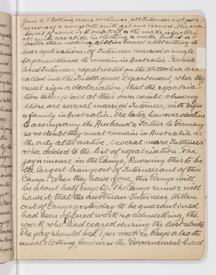 June 11. Clothing issue continues, all Internees not possessors of a complete suite, get one issued. The material of same is II quality & the make, is factory all suits are alike in clothing & make, but it is better than nothing. Allies board still sitting to hear aplicationes of Internees married or single for permittance to remain in Australia. Naturaliced Intenees, repatriated on the Willorhra are called into the Intelligence Departement, wher they must sign a declaration, that the repatriation takes place at their own wishe. Among those are several married Internees, with Wifes & family in Australia. The later however decline to acompany the Husband & Father to Germany so no doubt they must remain in Australia as the only alternative. Several more Internees wher added to the list of repatriation. The joy is immense in the Camp, knowing this to be the largest transport of Internees out of this Camp. When they hawe gone, this Camp will be about half empty. The Camp rumor will have it that the Austrian Internees, taken out of Camp yesterday to be quarantined had been offered work no admaking, the work, who had ceased during the last strike The pay should be & pound; 1 per week to keep also the usual clothing, becourse the Government had