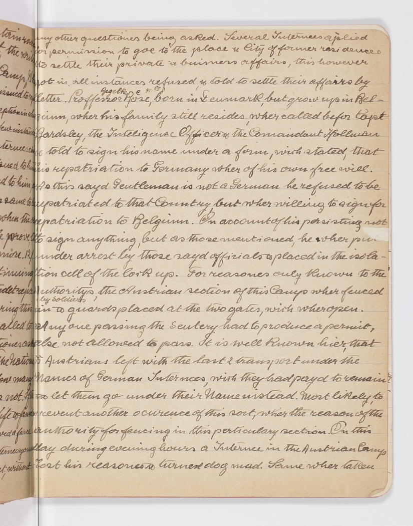 any other questiones being asked. Several Interneees aplied for permission, to goe to the place, & City of former residence to settle their private & business affairs, this however got in all instances refused, & told to settle their affairs by letter. Proffessor Begelke Boese, born in Denmark, but grown up in Belgium, wher his family still resides, wher called before Capt Bardsley, the Inteligence Officer & the Comandant Hollman & told to sign his name under a form, wich stated, that his repatriation to Germany wher of his own free will. As this sayd Gentleman is not a German he refused to be repatriated to that Country, but wher willing to sign for repatriation to Belgium. On account of his persisting not to sign anything, but as those mentioned, he wher put under arrest by those sayd officials & placed in the isolation cell of the lock up. For reasones only known to the Authorities, the Austrian section of this Camp wher fenced in by Soldiers & guards placed at the two gates, wich wher open. Any one passing the Sentery had to produce a permit, else not allowed to pass. It is well known hier, that 5 Austrians left with the last 2 transport under the Names of German Internees, wich they had payd to remain & let them go under their Name instead. Most likely, to prevent another ocurence of this sort, wher the reason of the authority for fencing in this particulary section. On thisday during evening hours a Internee in the Austrian Camp lost his reasones & turned dog mad. Same wher taken