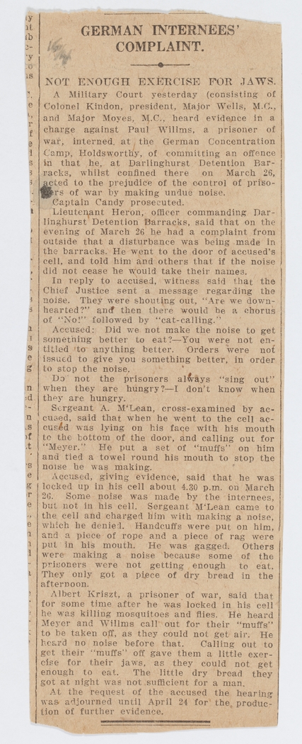 A Military Court yesterday (consisting of Colonel Kindon, president,Major Wells, M. C. and major Moyes, M. C. heard evidence in a chargeagainst Paul Willims, a prisoner of war, interned at the German Concentration Camp,Holdsworthy, of committing an offence in that he, at Darlinghurst Detention Barracks, whilst confined there on March 26, acted to the prejudice of the control of prisoners of war by making undue noise.