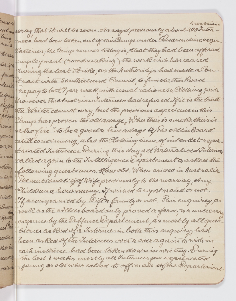 pray that it will be soon. As sayd previously about 200 Austrian Internees had been taken out of this Camp under Quarantine regulationes, the Camp rumor today is, that they had been offered employment (roadmaking) the work wich has ceased during the last strike, as the Authoritys had made a Contract with Sutherland Council, to finishe this Road The pay to be & pound; 1 per week, with usual rationes & Clothing, wich however the Austrian Internees had refused. If it is the truth the Writer cannot say, but the previous experience in this Camp has proven the old adage "Wher their is smoke, their is also fire" to be a good & true adage. 12/The Allies Board still continuing, also the clothing issue of intendet repatriated Internees. During this day, all Naturaliced Internees called again to the Intelligence Departement & asked the following questiones. How old. When arived in Australia The nationality of Wife previously to the marriag, Any Children & how many. If wished to repatriated or not. If acompanied by Wife & family or not. This enquirey, as well as the Allies board only proved a farce, & a unccessary expence by the Deffence Departement, as mostly all questiones asked of a Internees in both this enquiry, had been asked of the Internees over & over again & wich in each instance had been taken down in writing. During the last 3 weeks mostly all Internees for repatriated young or old wher called to officials of the Departement