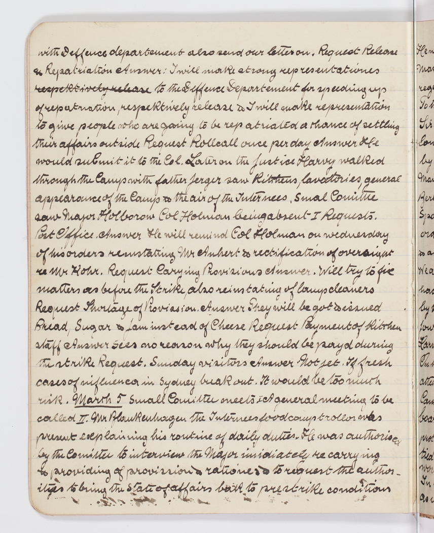 with Deffence department also send our letter on. Request Release & Repatriation Answer: I will make strong representations seek actively release to the Deffence Departement for speeding up of repatriation, respectively release & I will make representation to give people who are going to be repatriated a chance of settling their affairs outside Request Rollcall once per day Answer He would submit it to the Col. Later on the Justice Harvy walked through the Camp with father Jerger saw Kitchens, lavatories, general appearance of the Camp & the air of the Internees. Small Comittee saw Major Holborow Col Holman being absent I Requests. Post Office. Answer He will remind Col Holman on Wednesday of his orders reinstating Mr Anhert to rectification of oversight re Mr Kohn. Request Carying Provisions Answer. Will try to fix matters as before the Strike, also reinstating of lamps cleaners Request Shortage of Provisions. Answer They will be got & issued Bread, Sugar & Jam instead of Cheese Request Payment of Kitchen staff Answer sees no reason why they should be payd during the strike Request. Sunday visitors Answer Not yet. If fresh cases of influenca in Sydney break out. It would be too much risk. March 5 Small Comittee meets I A general meeting to be called II Mr Blaukenlurgen the Internees food comptroller was present explaining his routine of daily duties. He was authorised by the Comittee to interview the Major imidiately re carrying & providing of provision & rationes & to request the authorityes to bring the State of Affairs back to prestrike conditions
