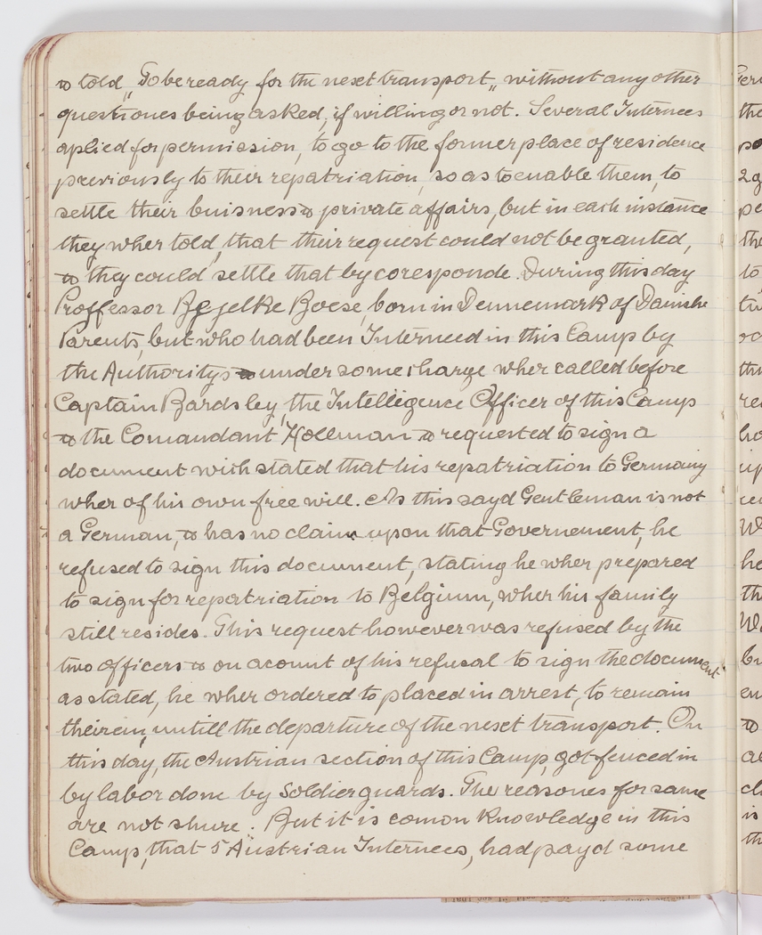& told "To be ready for the next transport" without any other questiones being asked, if willing or not. Several Internees aplied for permission, to go to the former place of residence previously to their repatriation, so as to enable them, to settle their business & private affairs, but in each instance they wher told, that their request could not be granted, & they could settle that by coresponde. During this day Proffessor Bejelke Boese, born in Dennemark of Danish Parents, but who had been Interneed in this Camp by the Authoritys & under some charge wher called before Captain Bardsley, the Intelligence Officer of this Camp & the Comandant Hollman & requested to sign a document wich stated that his repatriation to Germany wher of his own free will. As this sayd Gentleman is not a German, & has no claim upon that Governement, he refused to sign this document, stating he wher prepared to sign for repatriation to Belgium, wher his family still resides. This request however was refused by the two officers & on acount of his refusal to sign the document as stated, he wher ordered to placed in arrest, to remain therein until the departure of the next transport. On this day, the Austrian section of this Camp, got fenced in by labor done by Soldier guards. The reasones for same are not shure. But it is comon knowledge in this Camp, that 5 Austrian Internees, had payd some