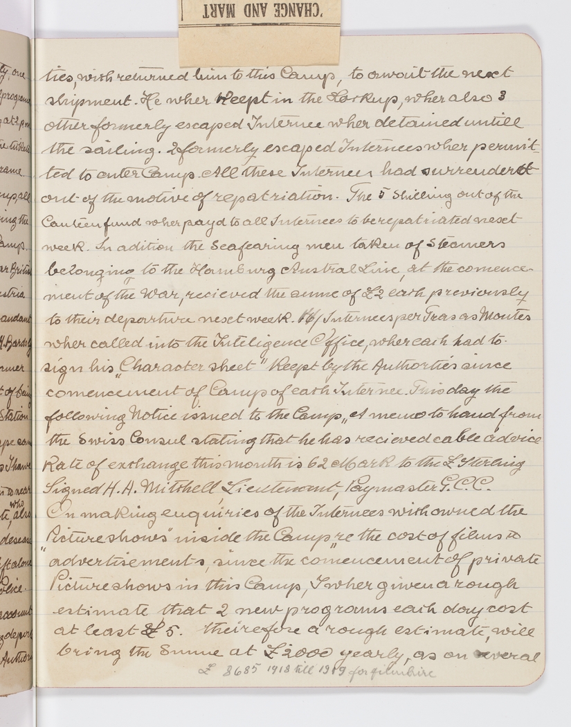 14/Internees per Gras as Montes wher called into the Inteligence Office, wher each had to sign his "Character sheet" kept by the Authorities since commencement of Camp of each Internee. This day the following notice issued to the Camp " A memo to hand from the swiss Consulstating that he has recieivedcable advice Rate of exchange this month is 62 Mark to the Sterling Signed H. H. Mitchell Lieutenant, Paymaster G. C. C.