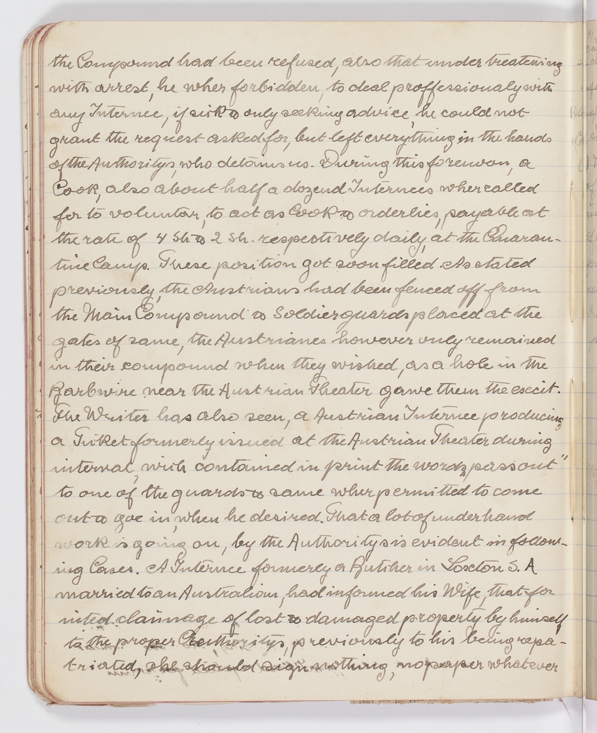 The Compound had been refused, also that under threatening with arrest, he wher forbidden ,to deal proffessiounaly with any Interneee, if sick & only seeking advice, he coulsd not grant the request asked for, but left everything in the hands of the Authorities, who detain us. During this (indecipherable), a Cook, also about half a dozen Internees wher called for to volunteer, to act as Cook & orderlies, payable at the rate of 4 sh & 2 sh. respectively daily,at the Quarantine Camp. These position got soon filled,As stated previously, the Austrians had been fenced offfrom the Main Compound & soldier guards placed at the gates of same, the Austrian Internee producing a Ticket formerly issued at the Austrian Theater during interval, wich contained in pront the words "passout" to one of the guards & same wher permitted to come out & goe in , when he desired. That a lot of underhand work is going on, by the Authorities is evident in following Cases. A Internee formerly a butcher in Loxton S. A. married to an Australian, had informed his wife, that for indecipherable claimage of lost & damaged property by himself to the proper Authorities, previously to his being repatriated she should sign nothing, no paper whatever