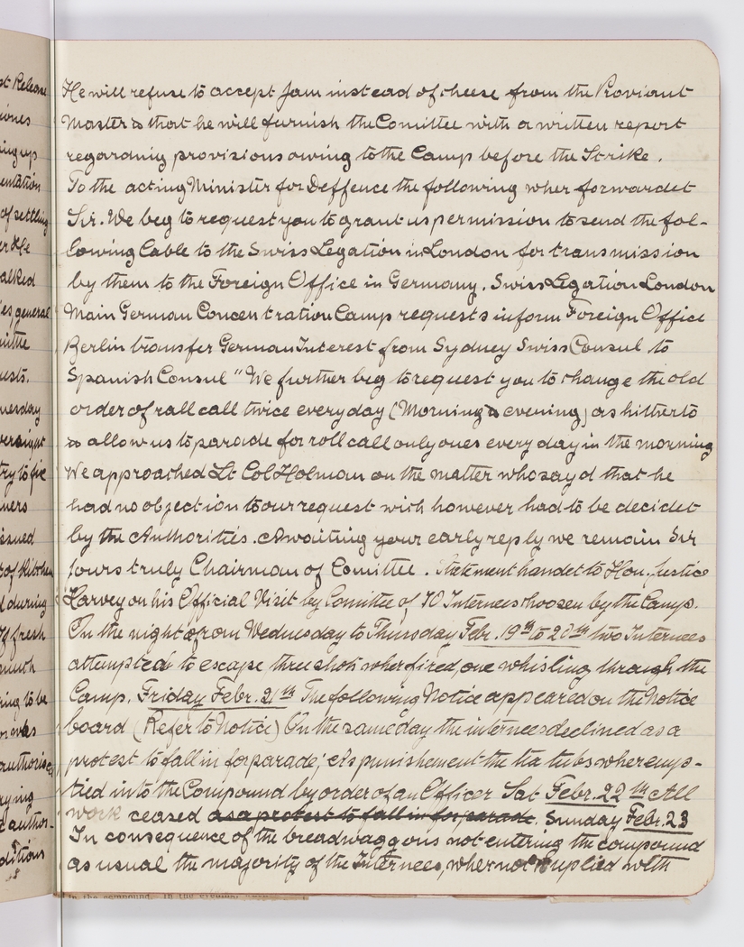 He will refuse to accept Jam instead of cheese from the Provisunt Master & that he will furnish the Comittee with a written report regarding provisions owing to the Camp before the Strike. To the acting Minister for Deffence the following wher forwardet Sir. We beg to request you to grant us permission to send the following Cable to the Swiss Legation in London for transmission by them to the Foreign Office in Germany. Swiss Legation London Main German Concentration Camp requests inform Foreign Office Berlin transfer German Interest from Sydney Swiss Consul to Spanish Consul "We further beg to request you to change the old order of roll call twice every day (Morning & evening) as hitherto to allow us to parade for roll call only ones every day in the morning We approached Lt Col Holman on the matter who sayd that he had no objections to our request wich however had to be decidet by the Authorities. Awaiting your early reply we remain Sir Yours truly Chairman of Comittee. Statement handet to Hon, Justice Harvey on his Official Visit by Comittee of 10 Internees choosen by the Camp. On the nights from Wednesday to Thursday Feb. 19th to 20th two Internees attempted to excape three shots wher fired, one whisling through the Camp. Friday Febr. 21th The following Notice appeared on the Notice board (Refer to Notice) On the same day the Internees declined as a protest to fall in for parade, As punishement the tea tubs wher emptied into the Compound by order of an Officer Sat Feb. 22th All work ceased as a protest to fall in for parade. Sunday Feb 23 In consequence of the breadwaggons not entering the compound as usual the majority of the Internees, wher not suplied with