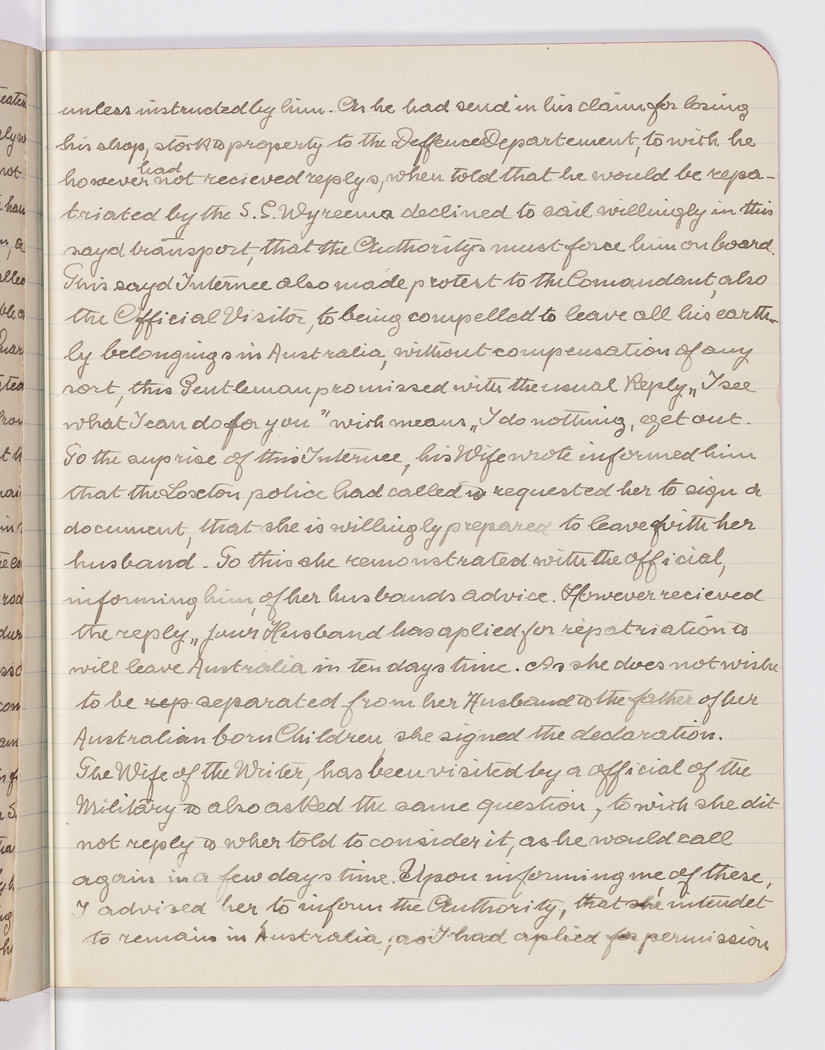 Unless instructed by him. As he had said in his claim for losing his stock & property to the Deffence Department, to wich he however had not received replys, when told that he would e repatriated by the S. S. Wyreena declined to sail willingly in this sayd transport, that the Authoritys must force him on board. His sayd Internee also made protest to the Comandant, also the official Visitor, to being compelled to leave all his earthly belongings in Australia, without compensation of any sort, this Gentleman promised with the usual reply" I see what I can do for you" wich means "Ido nothing, get out. To the surprise of this Internee, his wife wrote informwed himthat the Loxton police had called & requested her to sign a document, that she is willingly prepared to leave with her husband. To this she remonstrated with the official,informing him of her husbands advice. However received the reply 'your husband has applied for repatriation & will leave Australia in ten days time. As she does not wishe to be separated from her Husband & the father of her Australian born Children, she signed the dec;laration.